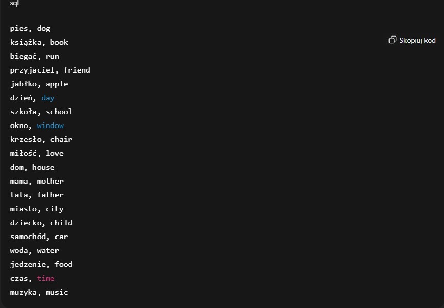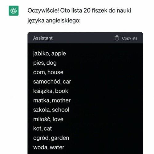 „Wygeneruj listę 20 fiszek do nauki języka angielskiego w formacie: słowo po polsku, tłumaczenie po angielsku. Każda fiszka w nowej linii”.