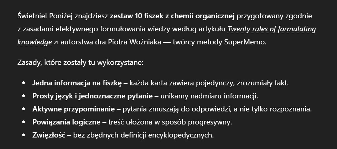 Pamiętaj! Jeśli chcesz przygotować fiszki, które będą najlepsze do nauki, skorzystaj z informacji zawartych w artykule: Effective learning: Twenty rules of formulating knowledge, w którym znajdziesz praktyczne i sprawdzone porady dotyczące tworzenia fiszek w formie pytań i odpowiedzi. Możesz wkleić ten artykuł do swojego polecenia dla AI, aby uzyskać jeszcze lepszą odpowiedź, np.